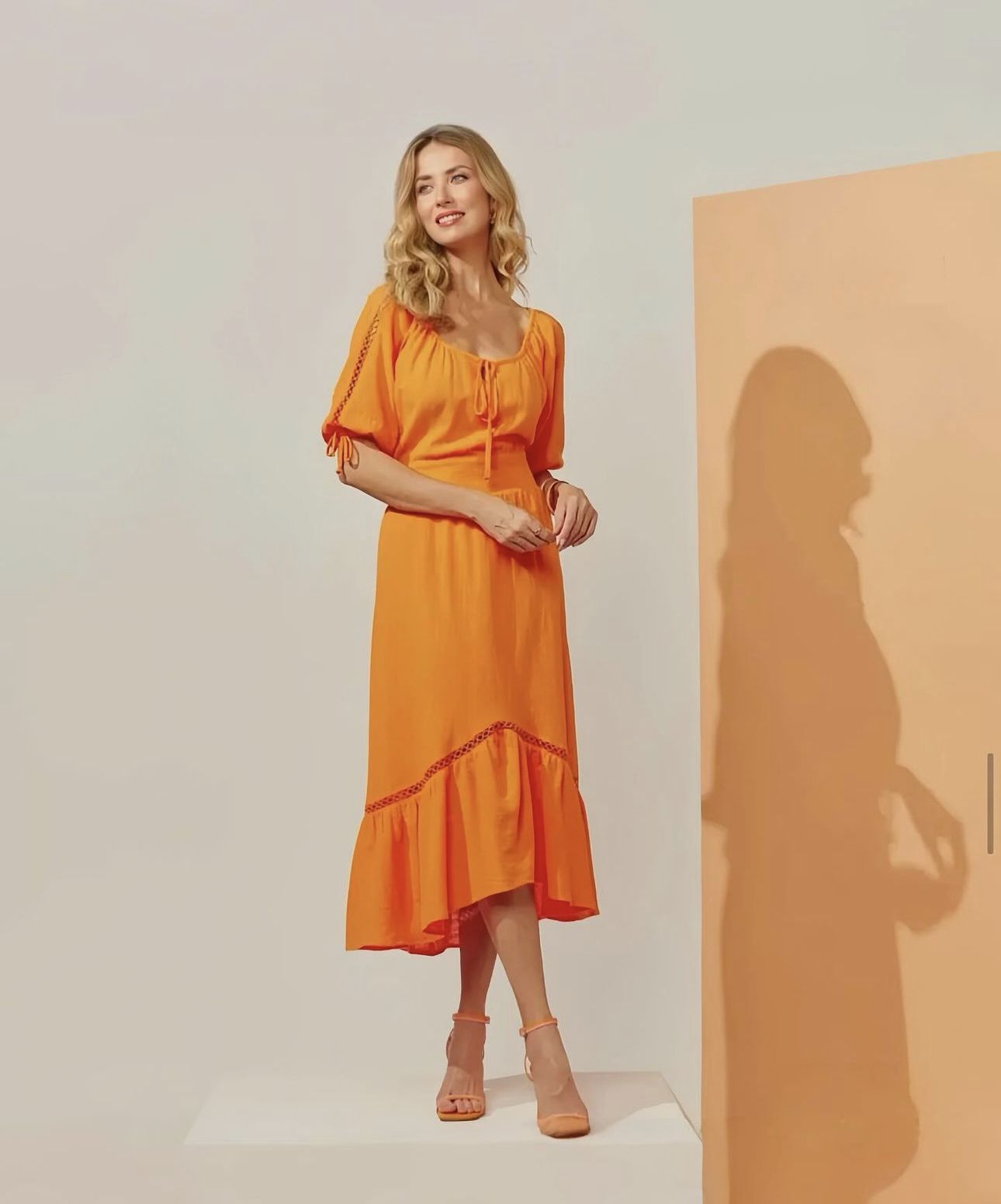 O Vestido JK Ponteira é a escolha perfeita para quem deseja unir estilo e conforto. Confeccionado em viscolinho, ele oferece um caimento leve e elegante. O design acinturado e reto valoriza a silhueta, enquanto o detalhe das ponteiras acrescenta um toque sofisticado e moderno. A cor laranja vibrante é ideal para quem quer se destacar em qualquer ocasião. Um vestido midi versátil que transita facilmente entre o casual e o sofisticado.
